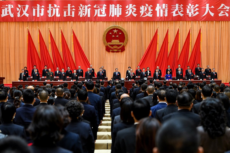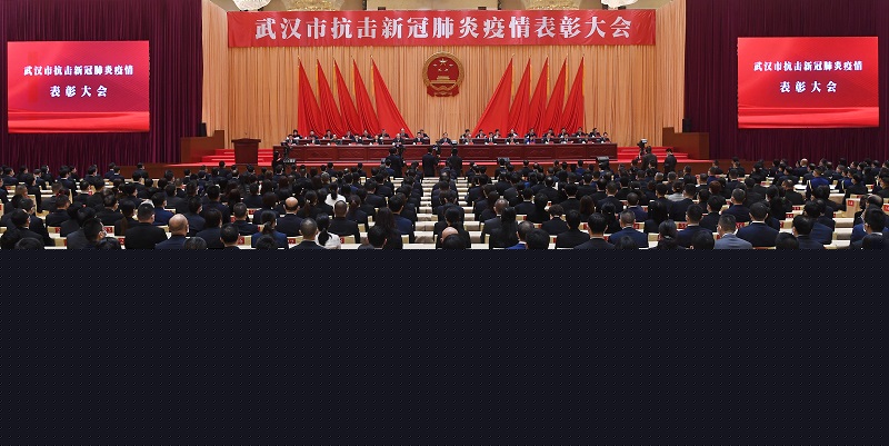 會場氣氛莊嚴(yán)熱烈。主席臺上方懸掛著“武漢市抗擊新冠肺炎疫情表彰大會”會標(biāo);后幕正中是熠熠生輝的中華人民共和國國徽,10面紅旗分列兩側(cè);會場后側(cè)豎起巨幅標(biāo)語:“緊密團(tuán)結(jié)在以習(xí)近平同志為核心的黨中央周圍,大力弘揚(yáng)偉大抗疫精神,主動作為,奮發(fā)有為,為加快建設(shè)國家中心城市,打造國際化大都市努力奮斗!”