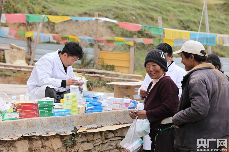 醫(yī)生為村民發(fā)放藥物(中央廣播電視總臺央廣記者 普布次仁 攝)