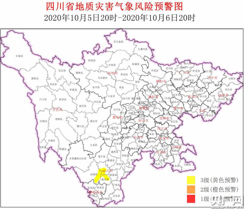 央廣網(wǎng)成都10月5日消息(記者劉濤)結(jié)合四川省氣象臺(tái)天氣預(yù)報(bào)情況,四川省地質(zhì)災(zāi)害指揮部辦公室發(fā)布10月5日20時(shí)~10月6日20時(shí),全省地質(zhì)災(zāi)害氣象風(fēng)險(xiǎn)預(yù)警3級(jí)黃色預(yù)警。