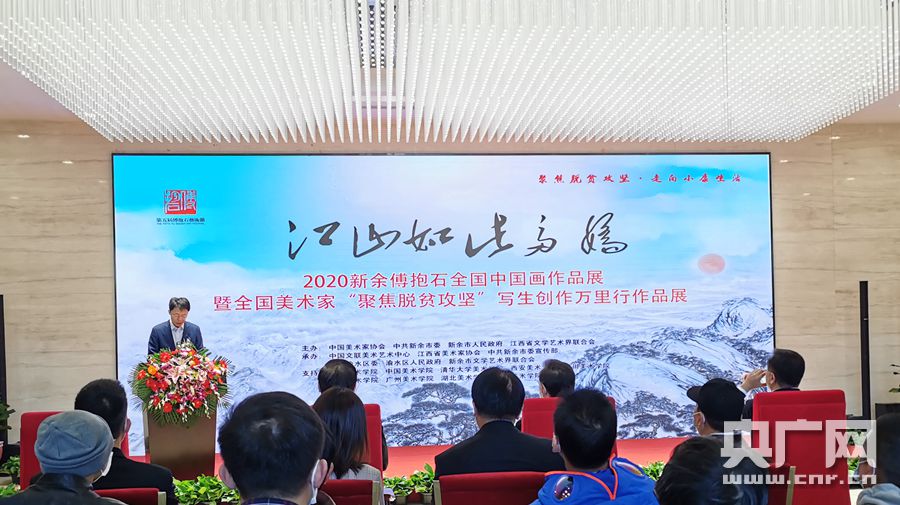 央廣網(wǎng)北京10月24日消息(記者魏文欣)10月24日,由中國(guó)美術(shù)家協(xié)會(huì)、中共江西新余市委、新余市人民政府、江西省文學(xué)藝術(shù)界聯(lián)合會(huì)聯(lián)合舉辦的“聚焦脫貧攻堅(jiān)、走向小康生活——2020‘江山如此多嬌·新余傅抱石’全國(guó)中國(guó)畫作品展”暨全國(guó)美術(shù)家“聚焦脫貧攻堅(jiān)”寫生創(chuàng)作萬(wàn)里行作品展在中國(guó)政協(xié)文史館開幕。中國(guó)美術(shù)家協(xié)會(huì)與設(shè)區(qū)市聯(lián)合開展“聚焦脫貧攻堅(jiān),走向小康社會(huì)”題材的寫生創(chuàng)作和展覽活動(dòng),在全國(guó)首開先河。