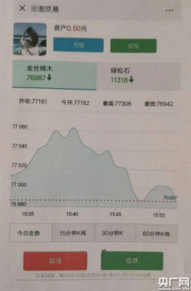 央廣網(wǎng)重慶11月12日消息(記者陳鵬)進(jìn)入專門的“交易市場”,預(yù)估金絲楠木、綠松石、天麻、藏紅花、天然橡膠、澳洲紅酒、松茸等“商品”的漲跌,預(yù)測準(zhǔn)確則可獲利。這種高大上的“金融游戲”,吸引了大量網(wǎng)友入坑。而實際上,所謂的“市場”只是一位程序員編寫的小程序,漲跌全是人為操作。
