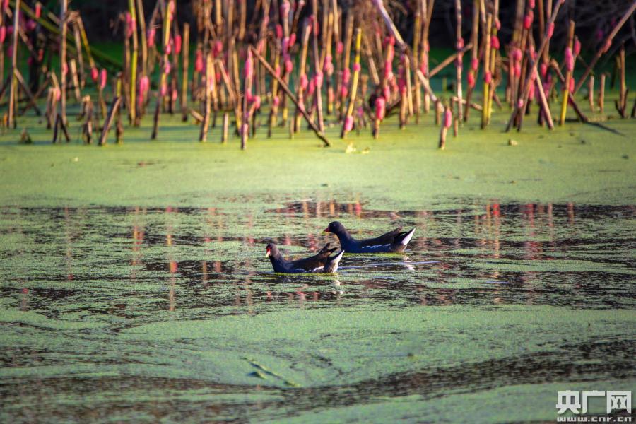央廣網(wǎng)九江11月14日消息(記者謝元森 通訊員陳扶南 杜春泉)日前,在江西省鄱陽湖都昌縣磯山湖水產(chǎn)基地“魚藕共作”的精養(yǎng)池內(nèi),棲息著一群黑水雞、斑嘴鴨、綠頭鴨、斑背潛鴨等近百只野生水鳥,它們?cè)谶@里覓食、嬉戲,形成一幅別樣的“雞鴨成群”的美景。