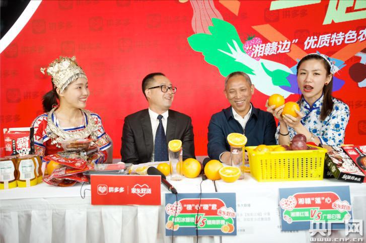 央廣網(wǎng)南昌11月14日消息(記者謝元森)當(dāng)贛南臍橙遇見麻陽冰糖橙,當(dāng)廣昌白蓮遇到湖南湘蓮,當(dāng)南昌拌粉遇到長沙米粉……這些湘贛優(yōu)質(zhì)農(nóng)產(chǎn)品的碰撞會(huì)擦出怎樣的火花?11月13日,第二屆江西農(nóng)業(yè)博覽會(huì)正式拉開帷幕,作為線上農(nóng)博會(huì)的重頭戲,拼多多“湘贛品牌農(nóng)產(chǎn)品大聯(lián)播”的直播間引來了大量網(wǎng)友圍觀。