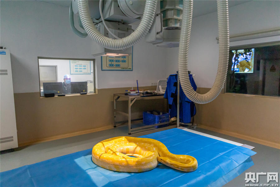 央廣網(wǎng)廣州12月21日消息(記者郭翔宇 通訊員鄧泳怡)生活在廣州長(zhǎng)隆野生動(dòng)物園的黃金蟒嬌嬌,近日在該園的動(dòng)物醫(yī)院接受了年度體檢。為了減少對(duì)黃金蟒的影響,體檢的過程中,院長(zhǎng)張?zhí)煊尤膛惆橹鴭蓩,而?dòng)物醫(yī)院的獸醫(yī),也將整個(gè)流程控制在35分鐘。圖為獸醫(yī)在給嬌嬌進(jìn)行稱重。不同的動(dòng)物有不同的稱重方式,為了能準(zhǔn)確稱量黃金蟒的體重,保育員找來了大保溫箱上“秤盤”。