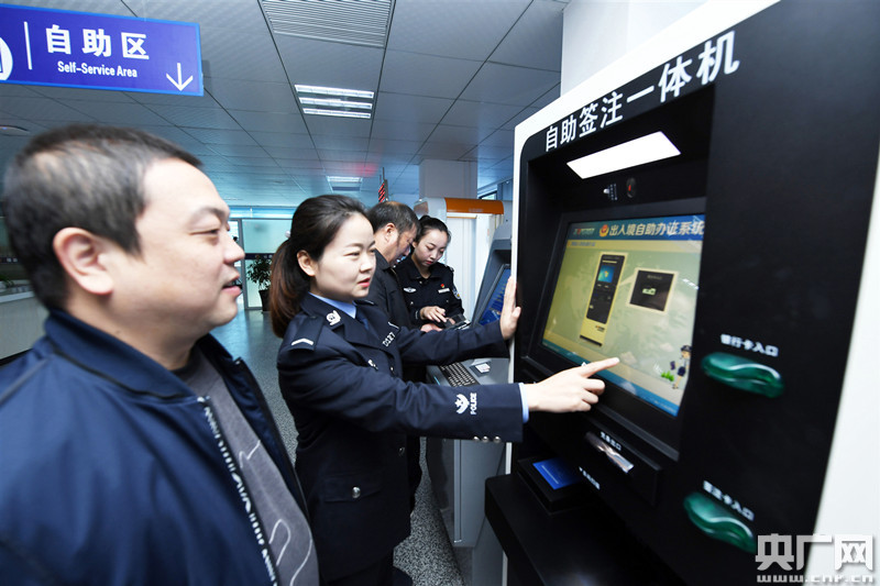 ?得窬笇(dǎo)市民通過自助簽注一體機(jī)辦理簽注業(yè)務(wù)(央廣網(wǎng)發(fā) ?倒补﹫D)