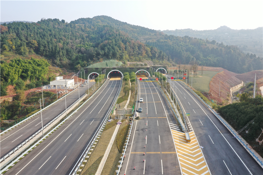 值得一提的是,成都天府國際機(jī)場高速公路龍泉山隧道采用的雙向十車道客貨分流四洞并行設(shè)計為全國首創(chuàng)。龍泉山隧道,全長4617m,隧道設(shè)計速度為120km/h,為分離式雙向四洞十車道。根據(jù)預(yù)測,將來新機(jī)場高速公路的車流量在10萬輛左右,由于進(jìn)隧道時車流量會下降5%左右,由此龍泉山隧道采用了雙向十車道設(shè)計,比主線多兩條車道,設(shè)計時速120公里且客貨分流,貨車從兩側(cè)隧道通行、小車從中間隧道通行,互相不影響。龍泉山隧道照明采用無級調(diào)光技術(shù),根據(jù)車流量大數(shù)據(jù)和隧道內(nèi)外光照情況,適時無極調(diào)整洞內(nèi)LED燈照度;加密設(shè)置被動反光設(shè)施、增設(shè)全斷面反光環(huán),有效指引道路線形,改善洞內(nèi)照明,大大降低運(yùn)營期能源消耗。