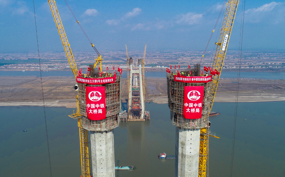 據(jù)了解,大橋橋址處河床地質(zhì)復(fù)雜,主塔墩樁基鉆孔深度最長(zhǎng)達(dá)到了110米,為國(guó)內(nèi)高鐵建設(shè)中樁基施工深度之最。中鐵大橋局五公司安九項(xiàng)目總工程師劉濤介紹,針對(duì)5號(hào)墩主塔高和全程都在水上作業(yè)的施工難點(diǎn),項(xiàng)目部特研發(fā)了大堤斜坡面深水矩形承臺(tái)施工工法、旋挖鉆加回轉(zhuǎn)鉆組合鉆孔工藝,并采用國(guó)內(nèi)首創(chuàng)的橋梁全面智能化溫控系統(tǒng)確保大體積混凝土施工質(zhì)量。大橋于2017年10月開(kāi)工建設(shè),目前已完成全橋總工作量的三分之二。