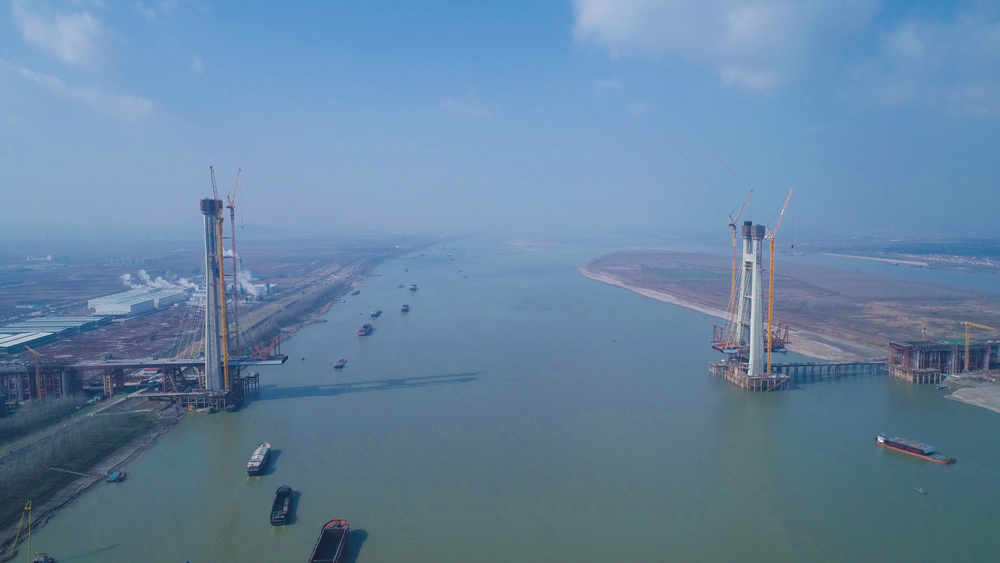 此次封頂?shù)?號(hào)墩主塔位于九江側(cè)永安堤防護(hù)堤邊坡上,屬于H型結(jié)構(gòu),高達(dá)242米,相當(dāng)于80層樓房高。建設(shè)者們采用液壓爬模分段施工,塔柱共41個(gè)節(jié)段,混凝土澆筑總方量為3.17萬(wàn)立方米。