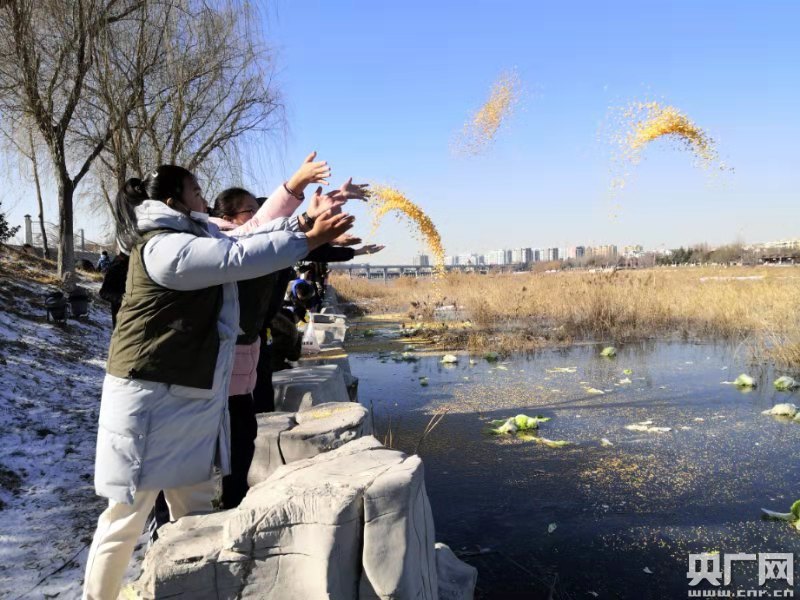 志愿者在青島市城陽區(qū)白沙河濕地撒放食物,助鳥類過冬(央廣網(wǎng)發(fā) 王海濱 攝)