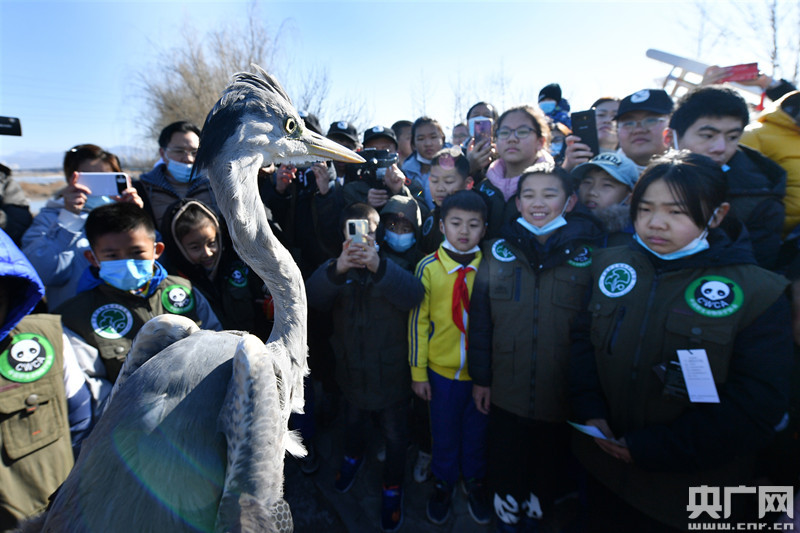 志愿者在科普并放飛當(dāng)?shù)刈匀毁Y源局救護的國家三有保護鳥類蒼鷺(央廣網(wǎng)發(fā) 王海濱 攝)
