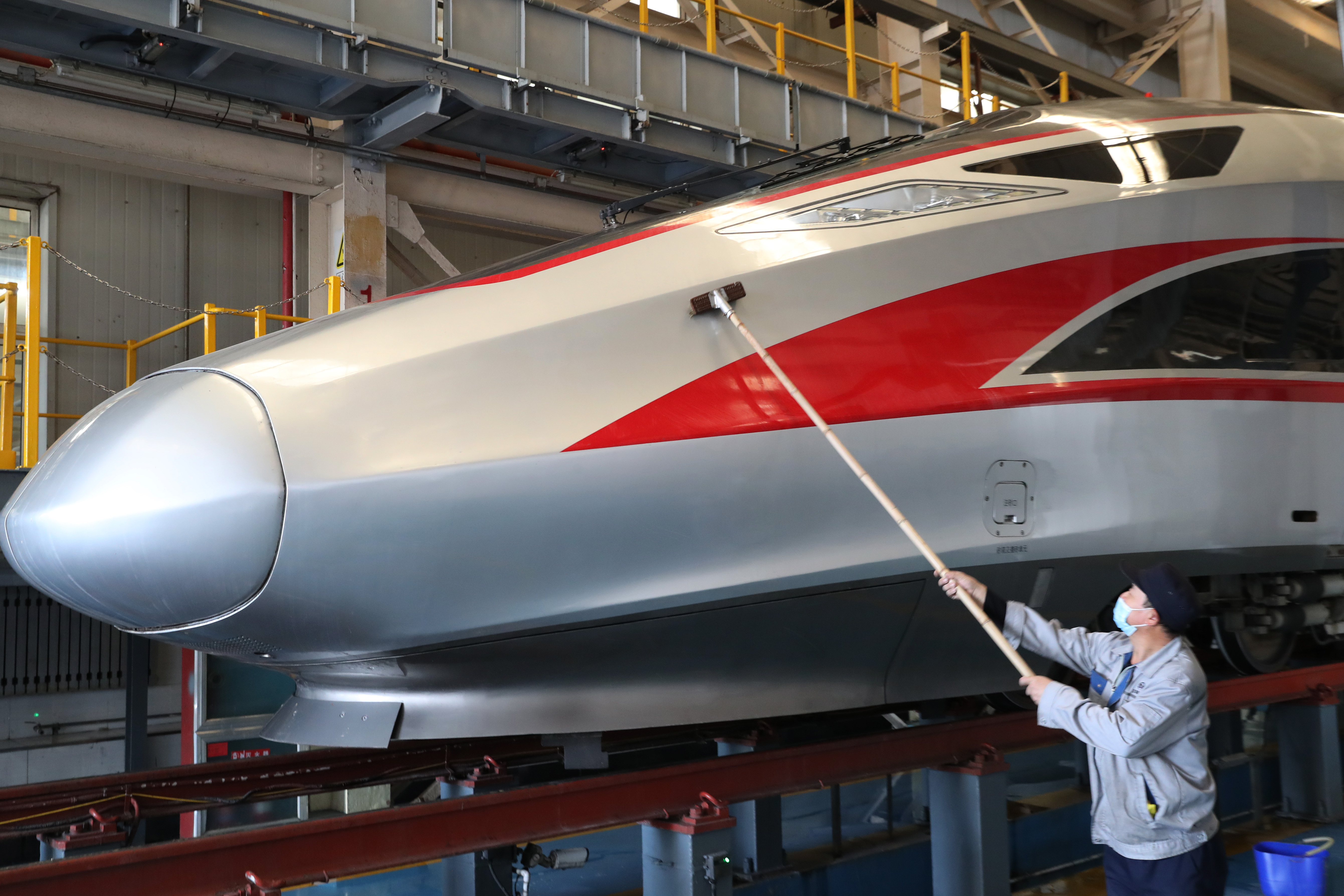 青島動車段的工作人員在對檢修的“復(fù)興號”動車組進(jìn)行外表清潔(央廣網(wǎng)發(fā) 張進(jìn)剛攝)