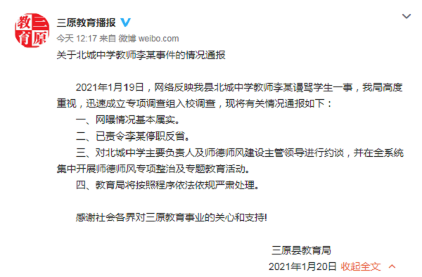 三原縣教育局官微通報顯示:2021年1月19日,網(wǎng)絡(luò)反映我縣北城中學(xué)教師李某謾罵學(xué)生一事,我局高度重視,迅速成立專項調(diào)查組入校調(diào)查,現(xiàn)將有關(guān)情況通報如下:一、網(wǎng)曝情況基本屬實。二、已責(zé)令李某停職反省。三、對北城中學(xué)主要負責(zé)人及師德師風(fēng)建設(shè)主管領(lǐng)導(dǎo)進行約談,并在全系統(tǒng)集中開展師德師風(fēng)專項整治及專題教育活動;四、教育局將按照程序依法依規(guī)嚴肅處理。