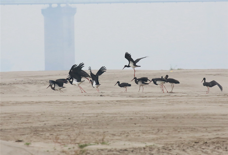 黑鸛種群在武漢天興洲越冬棲息(央廣網(wǎng)發(fā) 武漢市觀鳥協(xié)會供圖)
