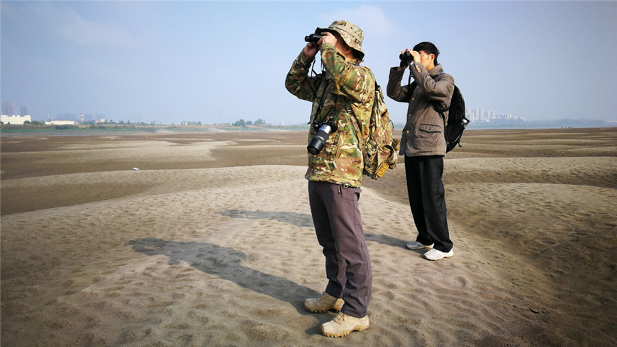 志愿者在洲頭沙灘開展黑鸛保護巡護(央廣網(wǎng)發(fā) 武漢市觀鳥協(xié)會供圖)
