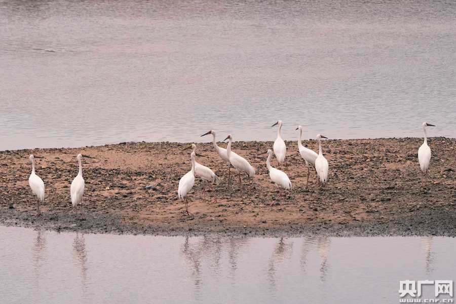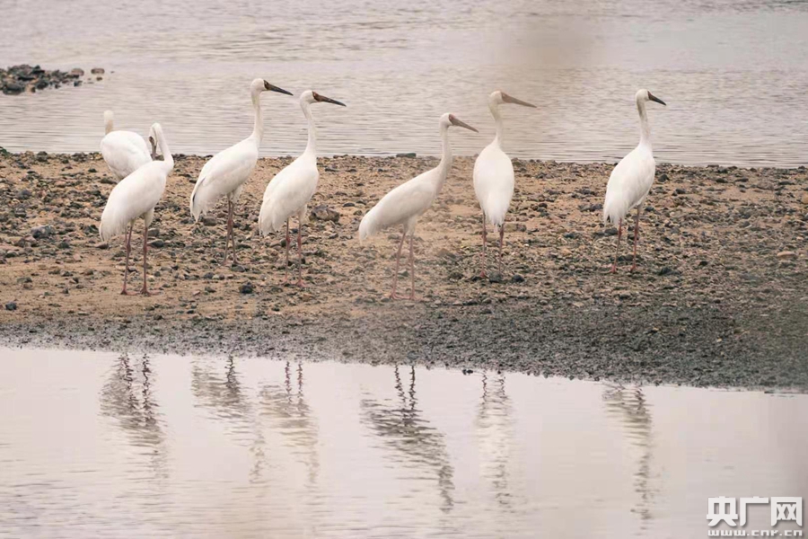 1月21日,發(fā)現(xiàn)的白鶴數(shù)量已增至11只。它們通體雪白、脖子修長、腿腳尖細,有秩序的排著隊,不時用尖尖的嘴巴捋著羽毛,叫起來聲音清亮,展翅飛翔時,翅膀內(nèi)側(cè)會露出黑色的羽毛,優(yōu)雅的身姿倒映在水面上,與周圍碧水、藍天、綠樹構(gòu)成了一幅亮眼的生態(tài)美景。