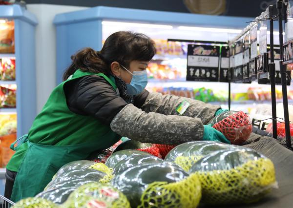 在固安縣一家大型超市內(nèi),超市工作人員正在擺放水果(央廣網(wǎng)發(fā) 門叢碩 攝)