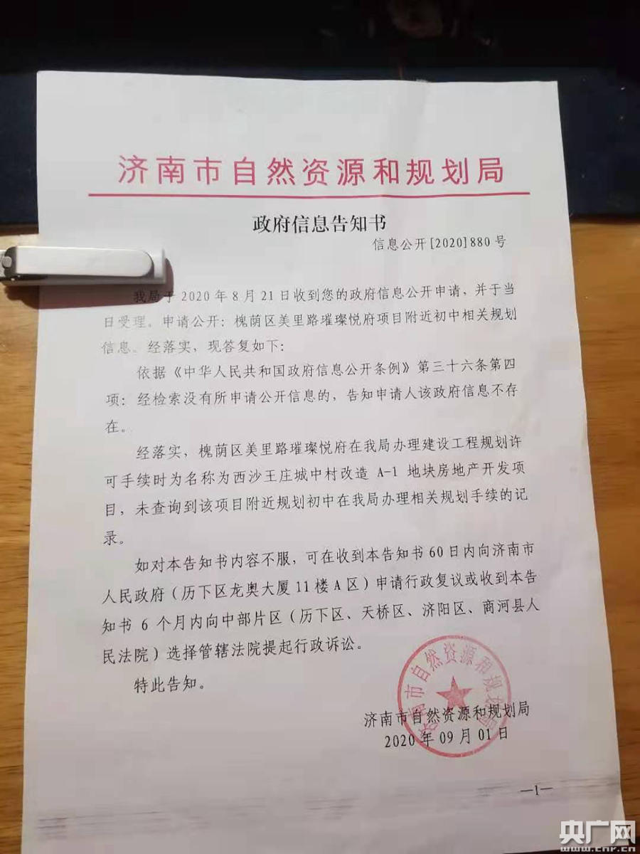 魏女士介紹,2020年9月1日,業(yè)主們向濟南市自然資源和規(guī)劃局提交的“槐蔭區(qū)美里路璀璨悅府項目附近初中相關規(guī)劃信息”政府信息公開申請得到了回復。文件中顯示,“經(jīng)落實,槐蔭區(qū)美里路璀璨悅府在我局辦理建設工程規(guī)劃許可手續(xù)時名稱為西沙王莊城中村改造A-1地塊房地產(chǎn)開發(fā)項目,未查詢到該項目附近規(guī)劃初中在我局辦理相關規(guī)劃手續(xù)的記錄!