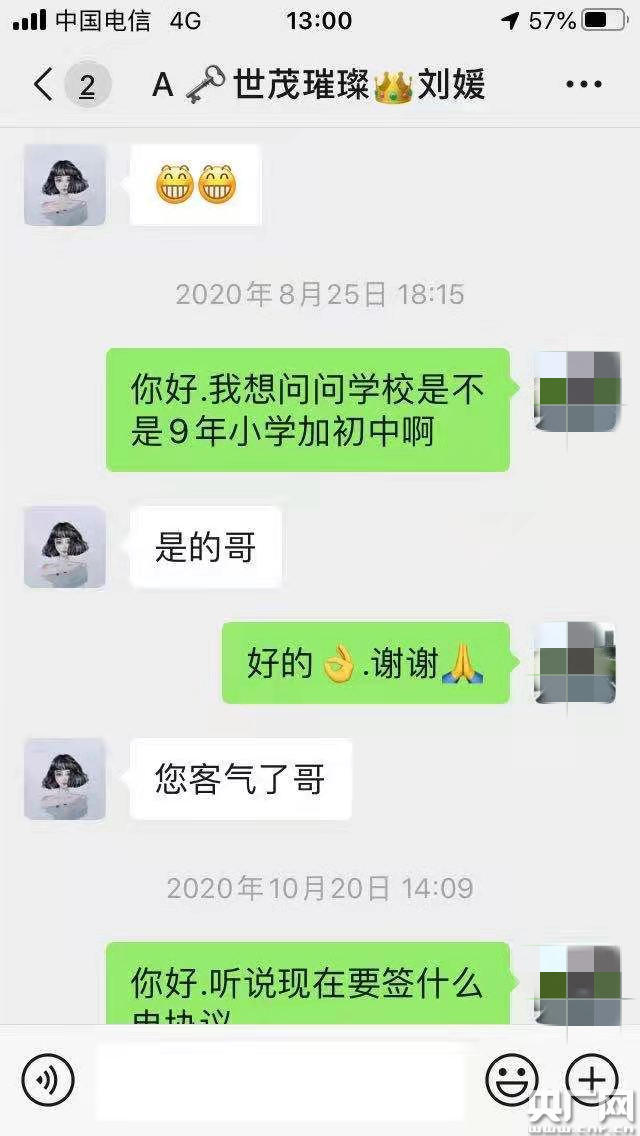 業(yè)主提供的聊天截圖中,售樓處工作人員承諾該小區(qū)有配套初中。(央廣網(wǎng)發(fā) 業(yè)主供圖)