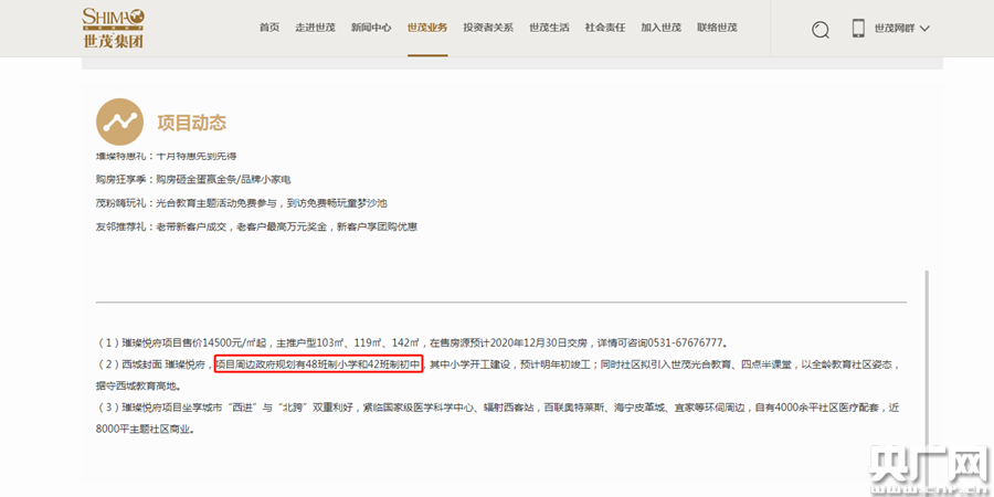 記者檢索發(fā)現(xiàn),在世茂集團官方網(wǎng)站上關于該樓盤的介紹中,確有顯示“璀璨悅府,項目周邊政府規(guī)劃有48班制小學和42班制初中,其中小學開工建設,預計明年初竣工;同時社區(qū)擬引入世茂光合教育、四點半課堂,以全齡教育社區(qū)姿態(tài),據(jù)守西城教育高地”的相關信息。