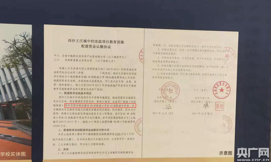 根據(jù)業(yè)主提供的《西沙王莊城中村改造項目教育設施配建資金認繳協(xié)議》顯示,配建資金認繳協(xié)議的乙方正是世茂璀璨悅府的開發(fā)商濟南智盈置業(yè)有限公司。認繳協(xié)議中明確,“項目范圍內(nèi)規(guī)劃建設48班配套小學和42班配套中學各一所。為確保該片區(qū)教育設施與所建設安置房同步規(guī)劃、同步建設、同步交付使用,保障片區(qū)規(guī)劃居住用地內(nèi)居民子女入學需求,該片區(qū)內(nèi)48班配套小學和42班配套中學由甲方先行建設。”“本宗土地競得人需向甲方繳納教育設施配建資金6300萬元!