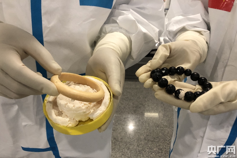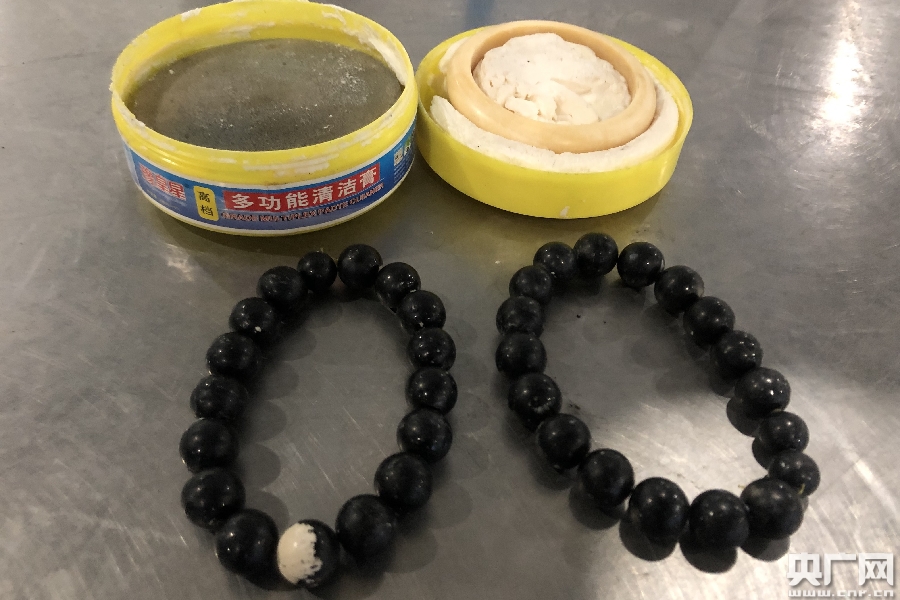 當(dāng)日,現(xiàn)場(chǎng)關(guān)員在監(jiān)管自開(kāi)羅入境航班時(shí),發(fā)現(xiàn)一名旅客的托運(yùn)行李機(jī)檢圖像存在異常。經(jīng)開(kāi)箱查驗(yàn),發(fā)現(xiàn)2件黑色手串,旅客自述為非洲黑木手串,但質(zhì)感、顏色與常見(jiàn)木制手串存在差異,F(xiàn)場(chǎng)關(guān)員用刀輕刮手串表面,發(fā)現(xiàn)外層是黑色涂料,內(nèi)見(jiàn)乳白色質(zhì)地,從紋理判斷疑似象牙制品。在對(duì)該旅客所有行李物品進(jìn)行徹底查驗(yàn)后,又在一個(gè)多功能清潔膏盒子中查獲嵌在膏體中的疑似象牙手鐲1件。經(jīng)清點(diǎn),該旅客共攜帶疑似象牙制品3件,重140克,其自述這些手鐲、手串是帶回國(guó)送給孩子的結(jié)婚禮物。隨后,現(xiàn)場(chǎng)關(guān)員又從同機(jī)另4名旅客托運(yùn)行李中查獲疑似象牙制品14件,重470克。