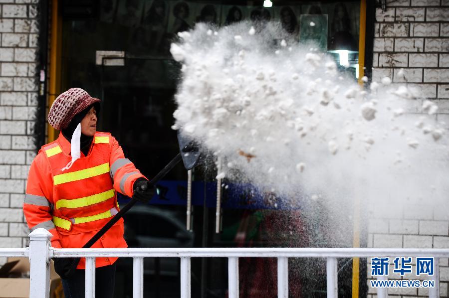 2月5日,一名環(huán)衛(wèi)工人在清理西寧街道上的積雪。受冷空氣影響,從2月5日凌晨開始,青海省多地出現(xiàn)降雪天氣,高原古城西寧市也迎來立春后的首場降雪。 新華社記者吳剛攝