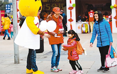 成都鐵路局千名青年志愿者“小橙子”暖心上崗,吉祥物“小橙子”與小旅客互動(dòng)。