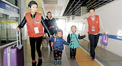 杭州春運(yùn)志愿者幫助旅客提拿行李并將他們送上火車。