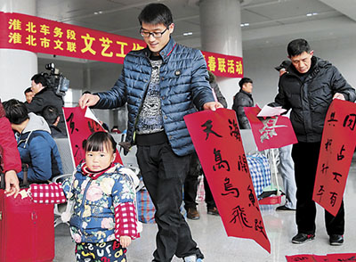 淮北車務(wù)段組織書法家們春運(yùn)送春聯(lián),祝福伴歸程。