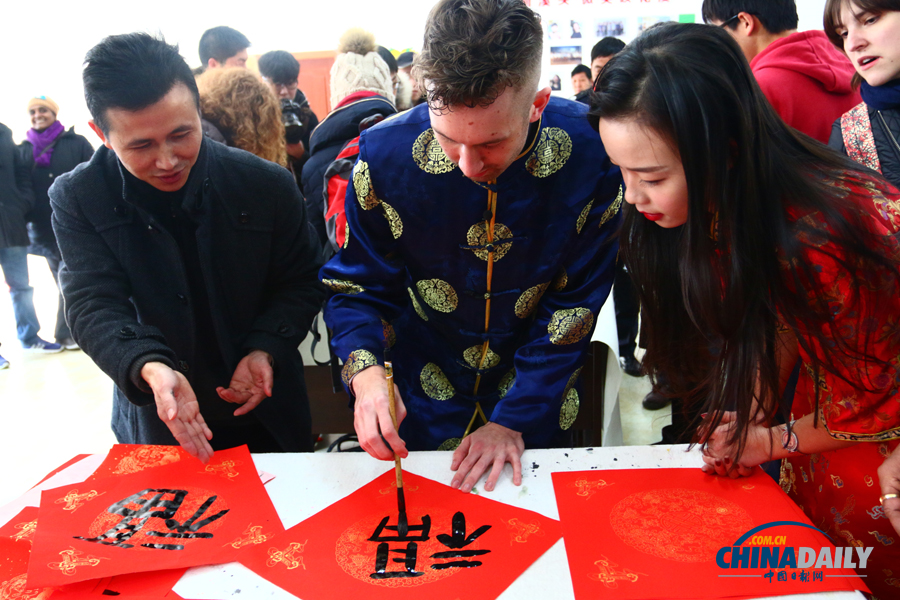 “春鬧三羊開景泰,花紅四海浴天香!睔g樂春節(jié)活動(dòng)現(xiàn)場,冰島女士Arna潑墨揮毫,寫下了這幅春聯(lián),表達(dá)了外籍人士對中國羊年的美好祝福。