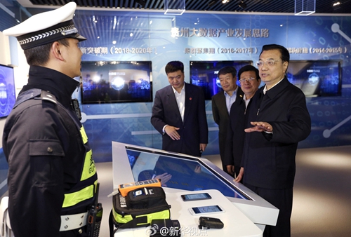 圖為14日,李克強在貴州考察北京·貴陽大數(shù)據(jù)應用展示中心。