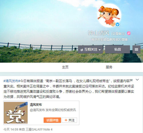 南京紀委:"副區(qū)長落馬在女兒婚禮現場被帶走"報道失實