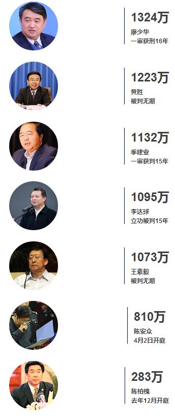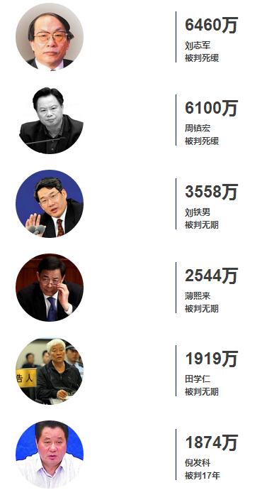統(tǒng)計顯示,十八大后最終宣判并認定貪腐金額的落馬官員有11人,分別是:原鐵道部長劉志軍,原政治局委員、重慶市委書記薄熙來,原國家發(fā)展和改革委員會副主任劉鐵男,山東省人民政府原副省長黃勝,原內(nèi)蒙古自治區(qū)黨委常委、統(tǒng)戰(zhàn)部部長王素毅,原廣西政協(xié)副主席、區(qū)總工會主席李達球,吉林原常務(wù)副省長,吉林銀行原黨委書記田學(xué)仁,原廣東省委常委、統(tǒng)戰(zhàn)部原部長周鎮(zhèn)宏,安徽省原副省長倪發(fā)科,原貴州省委常委、遵義市委書記廖少華、原江蘇省委常委、南京市市長季建業(yè)。湖北省政協(xié)原副主席陳伯槐,江西省人大常委會原副主任陳安眾2人已經(jīng)進入一審開庭審理程序。政知局小編根據(jù)判決書發(fā)現(xiàn),在這13名落馬高官中,2013年7月審判的原鐵道部部長劉志軍被認定的受賄金額最高,達6460余萬元;金額最少的是已經(jīng)進入一審開庭審理程序的陳柏槐案,其此前職務(wù)為湖北省政協(xié)副主席,去年12月24日,陳伯槐濫用職權(quán)、受賄一案開庭,檢察機關(guān)共指控其受賄283萬元。
