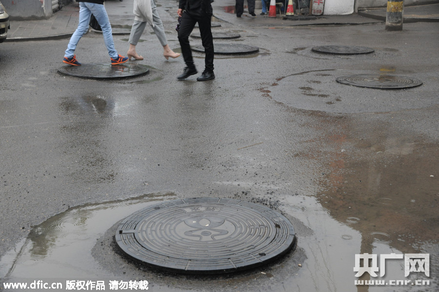 2015年4月28日,山東濟南,在濟南歷下區(qū)縣東巷中段,數十井蓋被拔高,由于密集排在路上,放學回家的家長騎車帶著孩子途徑此路,都要拐來拐去躲避障礙,如同考駕校“路考”。一位家長稱,此路附近有兩所學校,每天有數百學生要途徑此路上學,雖然天氣暖和后,到了路面和橋面修缺補坑的時候,但放學路上存在安全隱患。