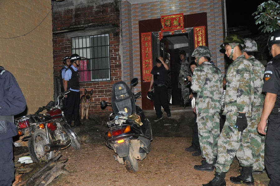 6月15日晚間至16日凌晨,廣西梧州警方調(diào)集600多名警力,出動大小運兵車及特種作戰(zhàn)車40多輛,重拳整治梧州藤縣的2個涉槍涉毒村落,搗毀了當?shù)匾伤浦茦尭C點和疑似制毒窩點,抓獲嫌疑人5人。