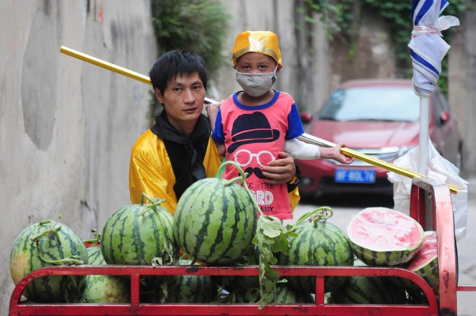 6月23日,在合肥市紅星路與宿州路交口,朱克良穿著孫悟空的衣服賣西瓜,只為了多掙點錢給兒子看病。