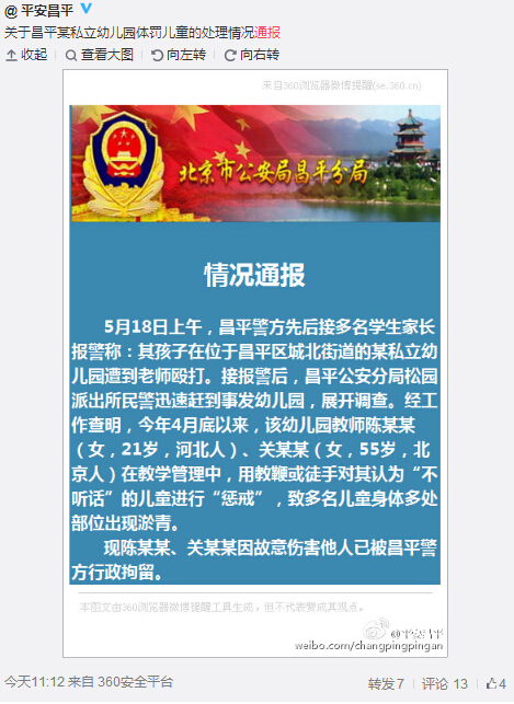 今日,北京市公安局昌平分局官方微博“平安昌平”發(fā)文公布調(diào)查結(jié)果稱(chēng),5月18日上午,昌平警方先后接多名學(xué)生家長(zhǎng)報(bào)警稱(chēng),其孩子在位于昌平區(qū)城北街道的私立幼兒園遭到老師毆打。接報(bào)警后,昌平公安分局松園派出所民警迅速趕到事發(fā)幼兒園,展開(kāi)調(diào)查。