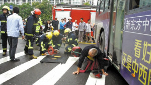 老人被卡公交車底 眾人合力抬車施救(圖)