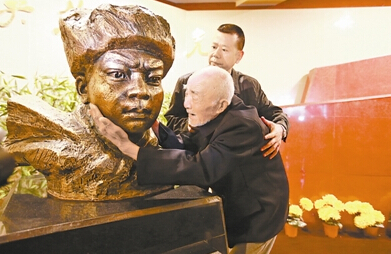 ↑李繼德老人參觀黃繼光紀(jì)念館,撫摸著黃繼光雕像激動(dòng)不已。特約記者孫紹建 攝
