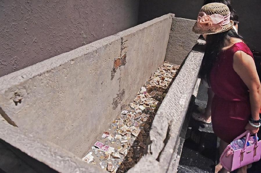游客在參觀河南省洛陽博物館石刻館內(nèi)的距今1500年北魏時期印有升仙圖案的石棺材,前來參觀游客,看到這口千年棺材表面為升仙圖案,紛紛相傳能為自己帶來財運和健康平安,于是不少游客以圖“吉利”爭相向石棺內(nèi)丟錢。