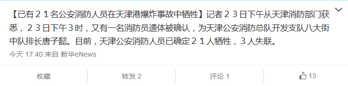 天津爆炸中又一名消防員遺體被確認(rèn) 仍有3人失聯(lián)