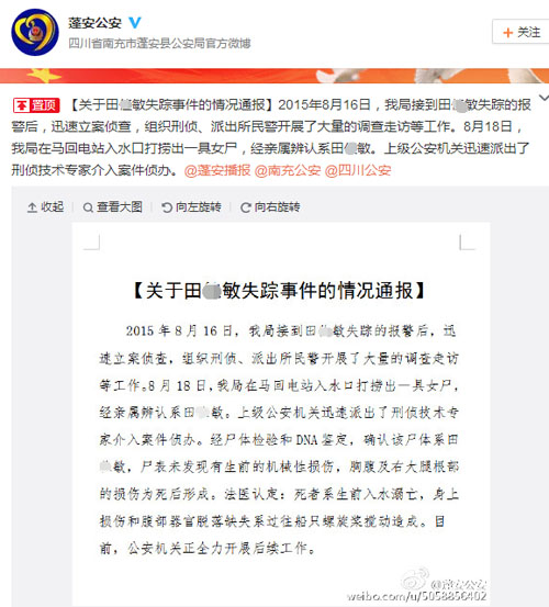 8月18日,失蹤女童田某敏的尸體在四川南充市蓬安縣馬回電站入水口被打撈上來,尸體的腹部和右大腿根部有損傷,且腹部器官缺失。網(wǎng)上有傳言稱,田佳敏死前被人挖去了器官。對(duì)此,四川省南充市蓬安縣公安局官方微博“蓬安公安”于8月22日發(fā)表微博澄清案情經(jīng)過,稱“尸表未發(fā)現(xiàn)有生前的機(jī)械性損傷,腹部及右大腿根部的損傷為死后形成。法醫(yī)認(rèn)定:死者系生前入水溺亡,身上損傷和腹部器官脫落缺失系過往船只螺旋槳攪動(dòng)造成!保ㄓ浾咝⒔鸩 實(shí)習(xí)生方格格)