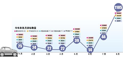 該人士分析,“不過,這次因為最低成交價和最高成交價相差這么大而棄標(biāo)的人已經(jīng)算比較多了,畢竟8月的平均價不是最高的!辈簧偈忻裾J(rèn)為9月競價的個人牌相對要多些,而且有了萬元底價成交的歷史,判斷9月車牌競價可能回落。但該人士分析,這也可能帶來另一種結(jié)果,即參與9月個人車牌競價的人會更多。另外,接近年底,市民購車欲望相對強烈,9月個人牌最終成交價也極有可能逆勢而上。