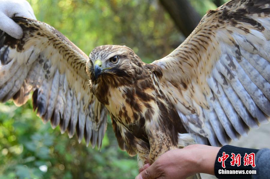 10月14日,河南鄭州,市民吳先生將一只灰褐色大鳥送到鄭州市林業(yè)局野生動物救護站。這只大鳥全身羽毛呈灰褐色,雙眼圓睜,尖嘴利爪,翅膀展開足有1.5米長。只要見人靠近,便展開翅膀,非常兇猛。專家鑒定該鳥為國家二級重點保護動物。 圖片來源:CFP視覺中國