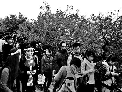 傍晚時(shí)分,返程的游客們正在香山公交站等車,有人喊了一嗓子去下一站植物園站乘車,于是幾百人的“隊(duì)伍”開始向植物園站走去。