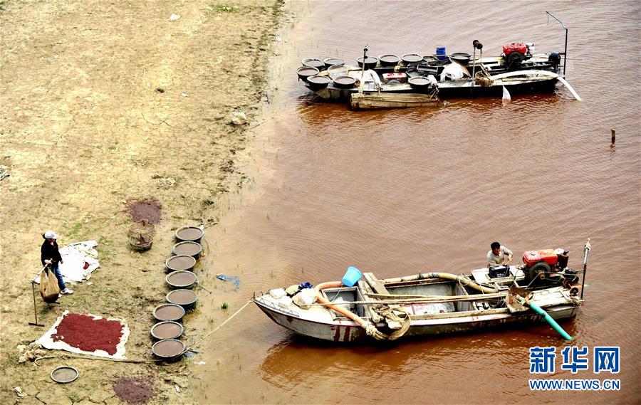 兩條打撈魚蟲的船只?吭谧兩奶旖颡(dú)流減河岸邊(2014年5月25日攝)。新華社記者岳月偉攝