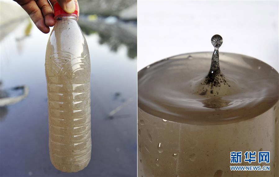 這張拼版照片的左圖為在天津市西青區(qū)某河渠采取的一瓶受污染的水(2013年7月23日攝),右圖為這瓶受污染的水的沉淀物在水面上濺起的水滴(2013年7月24日攝)。新華社記者岳月偉攝