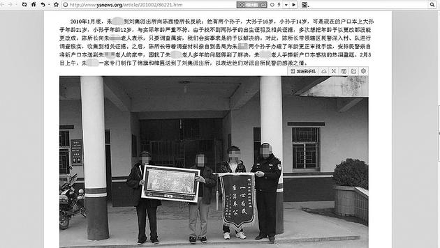 潁上縣政府網(wǎng)站上至今還掛著一篇表揚(yáng)稿,其中包括已調(diào)任劉集派出所所長的陳西樓為村民朱某的兩個(gè)孫子更改戶口信息一事。