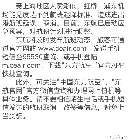 受上海地區(qū)大霧影響,虹橋、浦東機(jī)場(chǎng)能見(jiàn)度達(dá)不到航班起降標(biāo)準(zhǔn),造成進(jìn)出港航班延誤、取消。目前,東航已啟動(dòng)應(yīng)急預(yù)案,對(duì)航班計(jì)劃進(jìn)行調(diào)整。