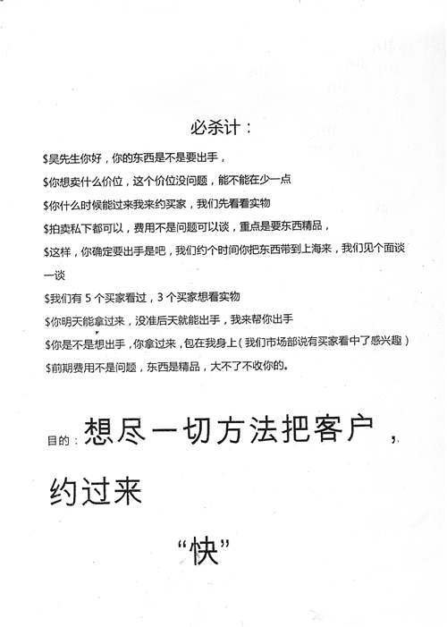 除了對外宣傳,該公司還雇傭了大量員工,通過網(wǎng)絡論壇、電話或微信尋覓被害人,用免費展示、高價代售等方式吸引了不少收藏愛好者。據(jù)事后了解,該公司給每位員工提供一份“話術(shù)單”,上面一步步地注明了如何招攬客戶,只要按照話術(shù)單操作,成功率能大大提高。